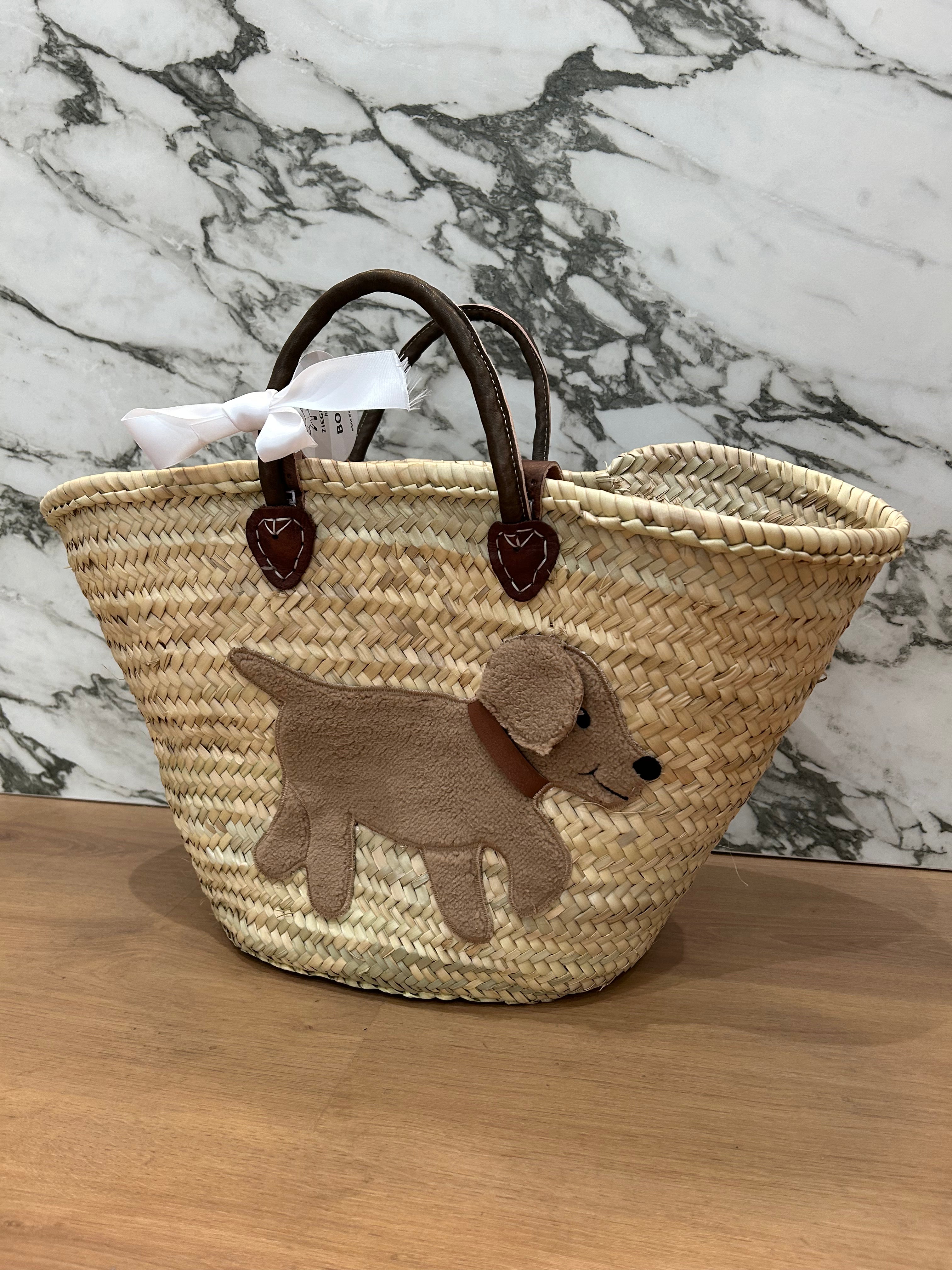 Die Korbtasche wird aus natürlichen Palmblättern handgeflochten und ist mit einer süßen Applikation verziert – ein echter Hingucker für Hundefans!