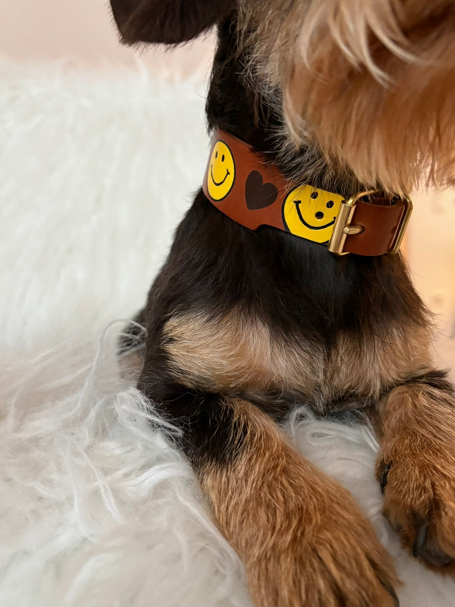Die Smileys und Herzen werden individuell von Hand gestaltet. Die Farben kannst du ganz nach deinem Geschmack auswählen. So entsteht ein persönliches Einzelstück mit eigenem Charakter für deinen Vierbeiner. Die Smileys bekommen eine schöne schwarze Umrandung - damit kommen sie richtig cool zur Geltung!