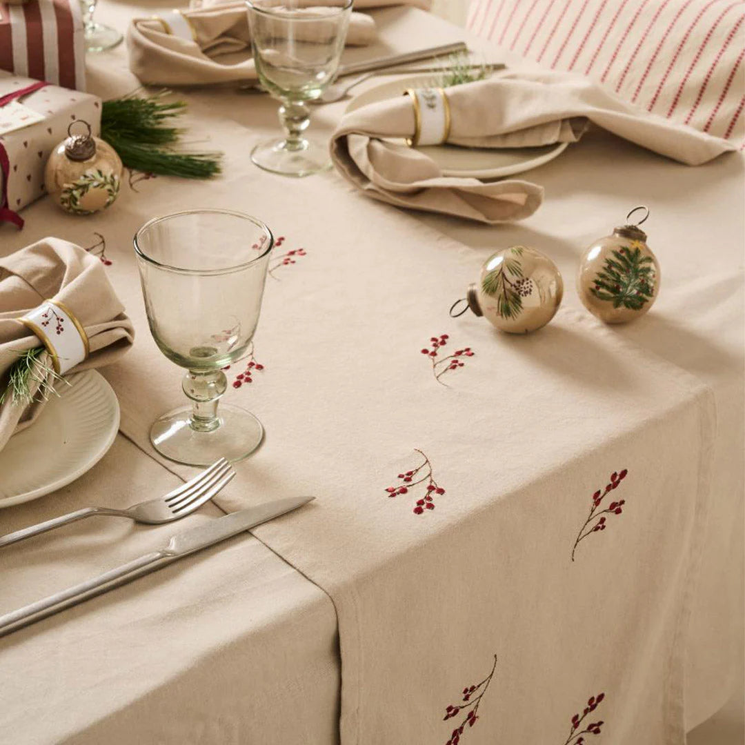 Der Tischläufer „Tradition“ bringt mit seinem natürlichen Leinenton und den fein gestickten Winterbeerenzweigen festliche Eleganz auf deinen Tisch. Das dezente Design verleiht dem Weihnachtstisch – aber auch jedem winterlichen Anlass – eine warme, einladende Atmosphäre.